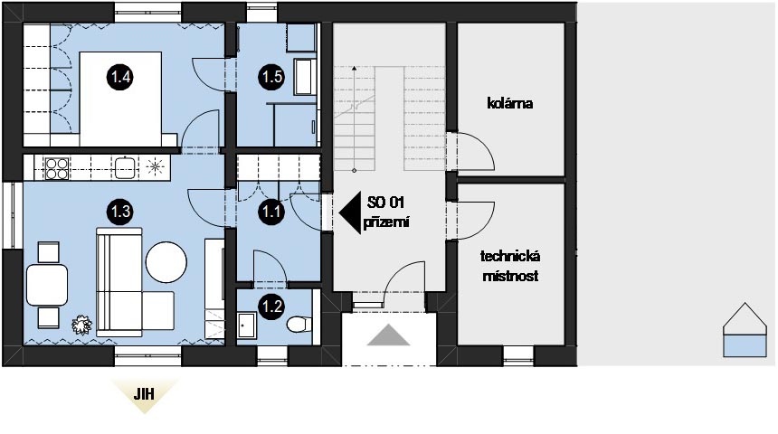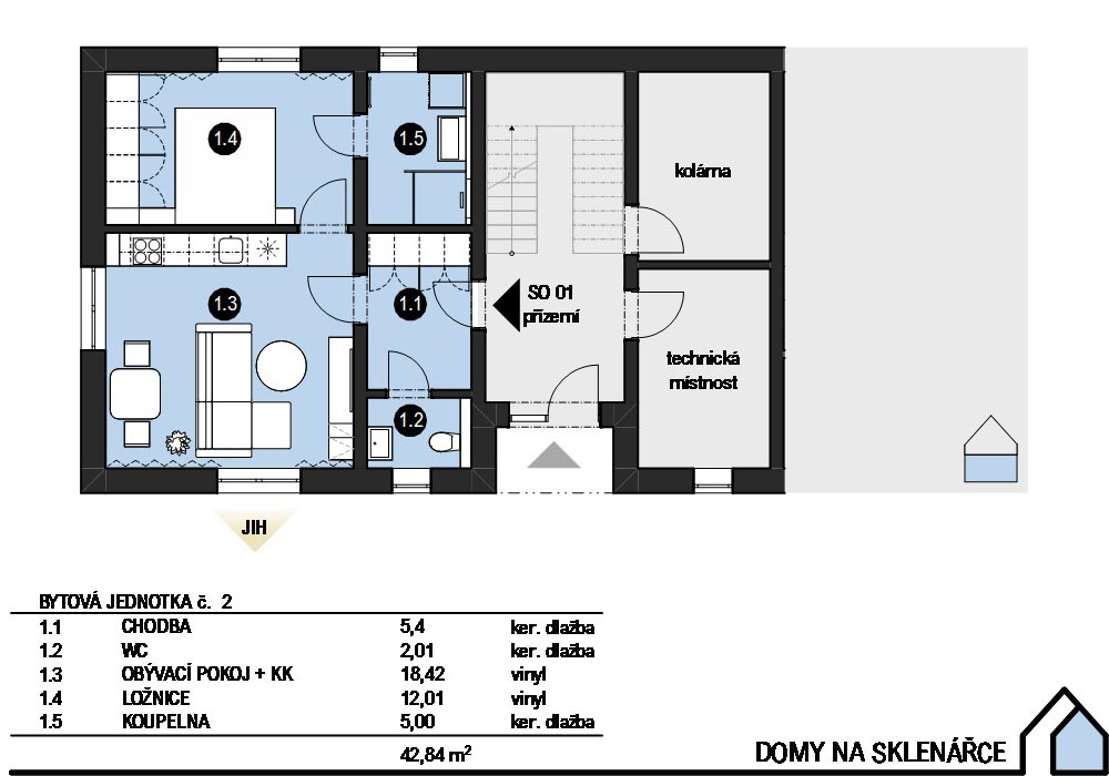 Komfortní byt o velikosti 42,8 m² nabízí promyšlené dispoziční řešení které zahrnuje obývací pokoj s kuchyňským koutem, samostatnou ložnici, koupelnu a samostatné WC. Dispozice je doplněna o vstupní chodbu s praktickým úložným prostorem. Jižní orientace hlavního obytného prostoru přináší příjemné prosvětlení po celý den. Vinylové podlahy v obytných místnostech a keramická dlažba v zázemí zajišťují komfort i odolnost.