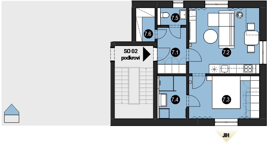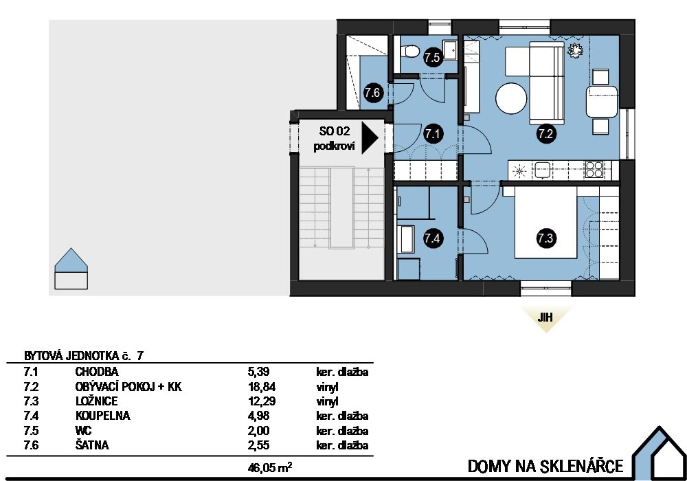 Tato jednotka o velikosti 46 m² nabízí promyšlené dispoziční řešení a dostatek úložného prostoru. Dominantou bytu je světlý obývací pokoj s kuchyňským koutem orientovaný na jih, který navazuje na ložnici. Samostatná šatna poskytuje praktické místo pro uložení oblečení či sportovního vybavení. Vinylové podlahy v obytných místnostech zajišťují útulnou atmosféru, zatímco keramická dlažba v chodbě, koupelně a na WC usnadňuje údržbu. Byt je ideální pro ty, kteří hledají kombinaci pohodlí, funkčnosti a klidného horského prostředí.